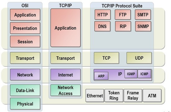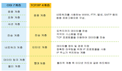 TCP/IP는 OSI 모델과 다르게 보통 네 계층 구조로 응용 계층, 전송 계층, 인터넷 계층, 링크 (네트워크 인터페이스) 계층으로 나눈다. 중간 블록이 계층구조, 최우측 블록이 구성 요소라고 보면 된다.
