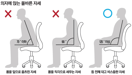 추가로, 의자 등받이에 몸을 맡기는 것을 안 좋은 자세라며 두려워하지말자. 중앙의 그림처럼 목이 자연스레 앞으로 나오는 우리들은, 차라리 몸을 뒤로 기대게 되면 자연스럽게 무게중심이 잡혀 척추에 부담이 덜해진다. 그래도 엉덩이을 뒤로 딱 붙혀놓은 것은 지키도록 하자.